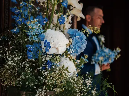 L'allestimento, realizzato su richiesta degli sposi, ha creato un'atmosfera di sogno e di romanticismo. Le gradazioni di azzurro e bianco, si sono fuse armoniosamente, creando un'esplosione di luce e di gioia.
